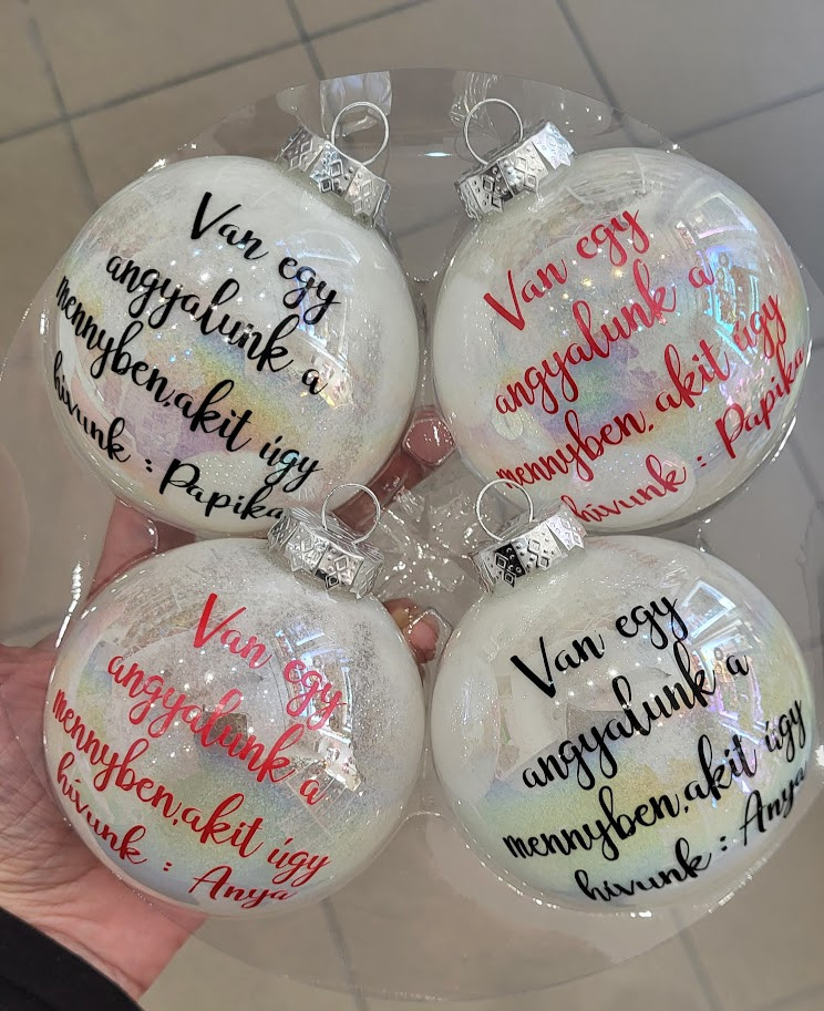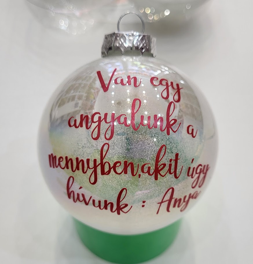 Különleges, kézzel készített emlékgömb, amelyen a felirat fix, de a név személyre szabható. Meghitt karácsonyi dísz, mellyel megőrizheted szeretteid emlékét.