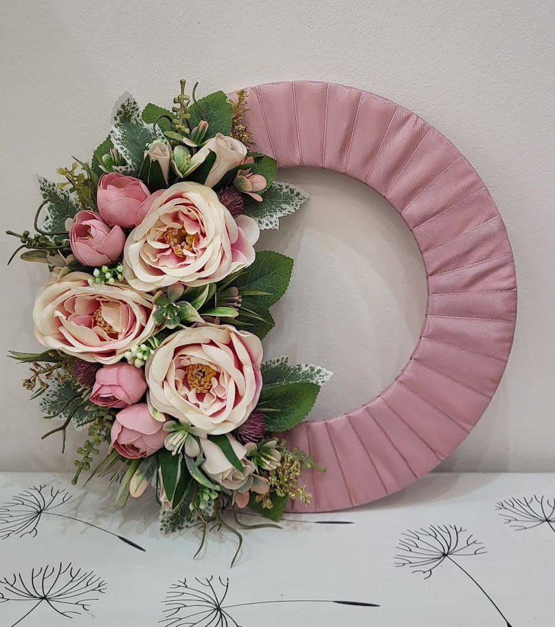 Különleges alap: A 25 cm-es fa alapot nagy gonddal, mályvaszínű, fényes szatén szalaggal tekertem körbe. Ez a selymes csillogás adja meg a koszorú elegáns és luxus alapját.