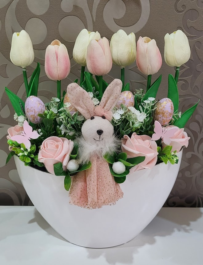 Nyuszi ül a fűben, csacsogva, dalolva...és megcsodálva a gyönyörű, élethű tulipánokkal és rózsákkal díszített húsvéti asztaldíszt!Ha Te is szeretnél egy ilyen csodás húsvéti asztaldíszt, amivel elvarázsolhatod a vendégeidet, akkor itt az alkalom, hogy meg