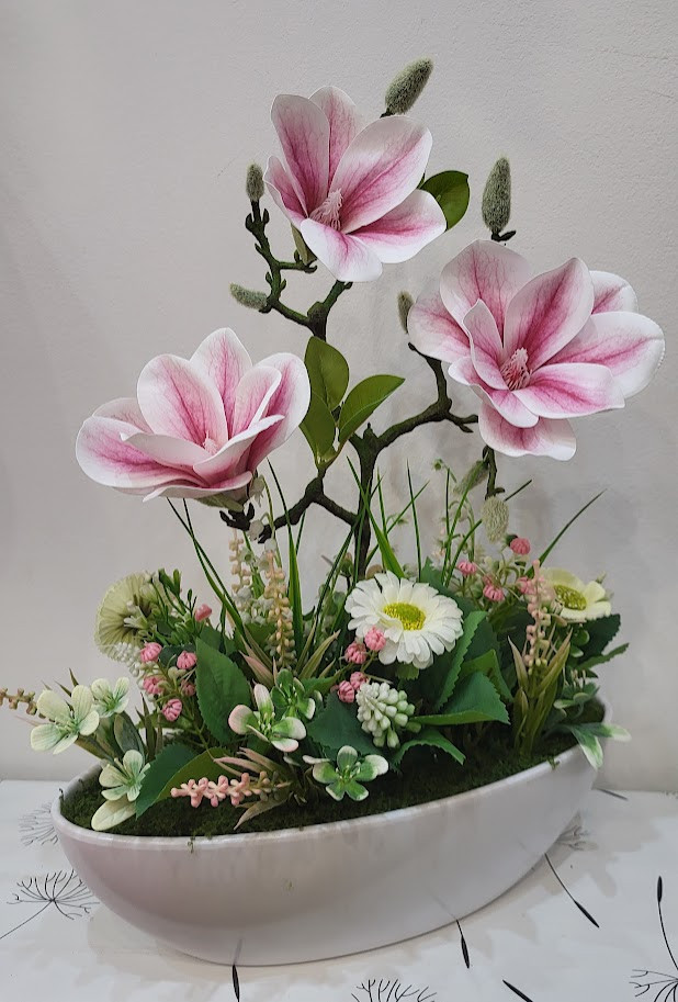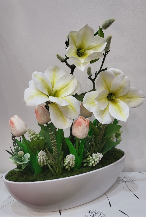 A magnólia a tavasz egyik legarisztokratikusabb virága, amelynek látványa mindenkit lenyűgöz. A Dekor-virágműhelyben most egy különleges, ovális formájú tálba költöztettük ezt a csodát, hogy az édesanyák és nagymamák otthonát hosszú évekig díszíthesse. A finom, selymes szirmok és a gondosan kidolgozott rügyek annyira élethűek, hogy nehéz megállni, ne hajoljunk közel megillatolni őket.