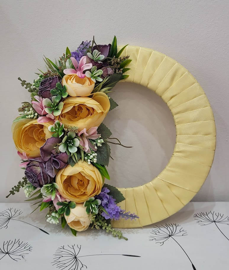 Ha szereted a merész, mégis harmonikus színeket, ezt a kopogtatót neked találtam ki. A sárga vidámsága és a lila eleganciája tökéletes kontrasztot alkot ezen a modern, 25 cm-es ajtódíszen.